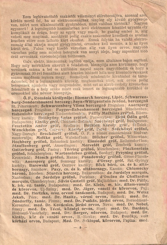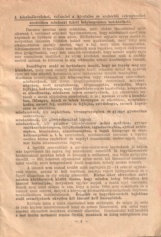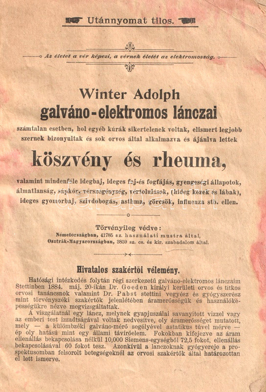A századfordulón működÅ‘ Adolph Winter szceczini homeopata, galvano-elektromos módszerrel operáló természetgyógyász és vállalkozó egész kiadványt szánt működése magasztalásának. A bevezetés szerint áramütéssel mindenféle bajokat gyógyÃtó elektromos lánca hathatósan veszi fel a harcot a köszvénnyel, reumával, idegbántalmakkal, görcsökkel, fogfájással és fejfájással és egyebekkel. A szerzÅ‘ - hitelessége bizonyÃtására - többször is leszögezi, hogy orvosi eszköze Németországban és az Osztrák-Magyar Monarchiában bejegyzett szabadalomnak számÃt. A testre veendÅ‘ eszközt mindössze viselni kell, ám a teljes hatás érdekében két láncot kell alkalmazni, egyet nappalra, egyet estére. SzerzÅ‘nk bámulatos terjedelemben ismerteti legmagasabb körökbÅ‘l való klientúráját, majd a 7. oldaltól a köszönÅ‘levelek sora érvel az orvosi csodaszer hatékonysága mellett. A valódi aranyozást mutató rézláncok képes illusztrációja a belsÅ‘ borÃtón szerepel. A varázsszert áruló vállalkozó 1909-ben ad hÃrt utoljára vállalkozásáról, nem sok jót sejtetÅ‘, többszöri cégnév-változtatás után feltehetÅ‘en beszüntette megtévesztésen alapuló vállalkozását.