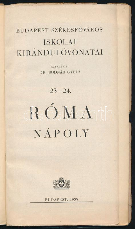Dr. Bodnár Gyula (szerk.): Róma, Nápoly. Budapest Székesfőváros iskolai kirándulóvonatai 23-24. Bp., 1938. Kiadói viseltes papírkötés, kopottas állapotban.