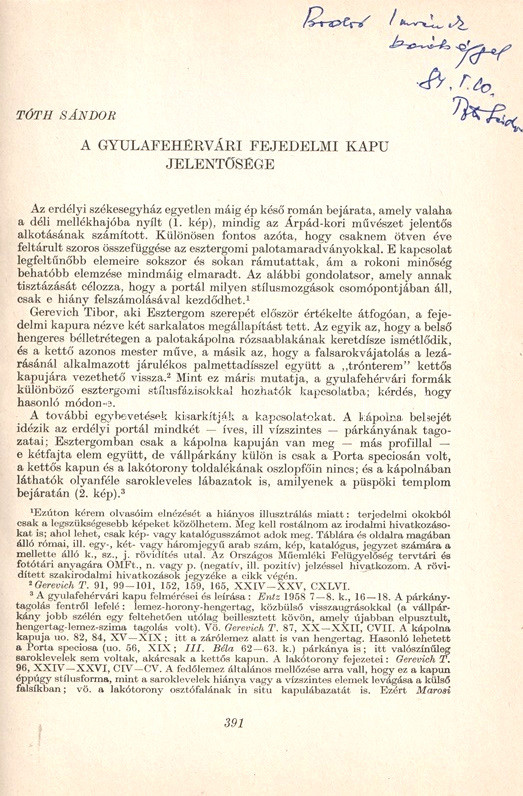 A gyulafehérvári fejedelmi kapu jelentősége. [Dedikált.]