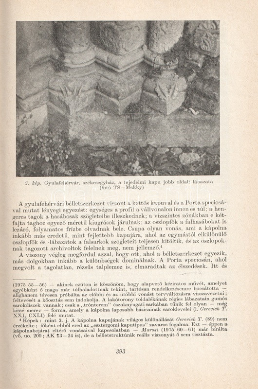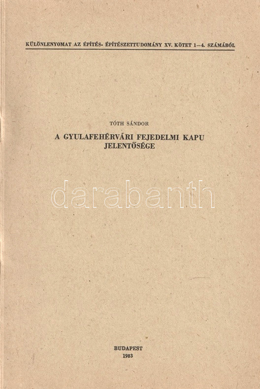 Tóth Sándor (1940-2007) művészettörténész, elsősorban az Árpád-kor építészettörténetét kutatta. Oldalszámozáson belül szövegközti és egész oldalas rajzokkal, felvételekkel, alaprajzzal illusztrált tanulmánya a gyulafehérvári székesegyház román kori részleteinek motívumkincsét vizsgálja.