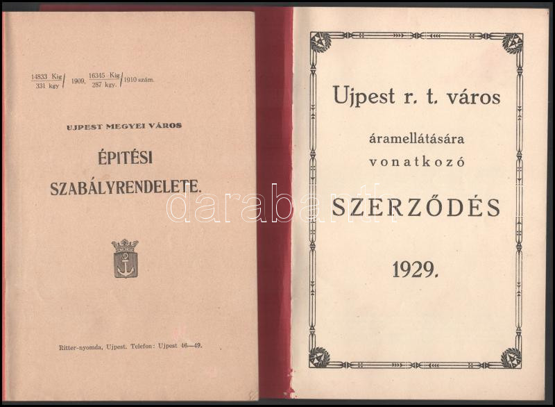 Újpest megyei város építési szabályrendelete. Újpest, 1929, Ritter Jenő. Kiadói papírkötés, jó állapotban. + Újpest r.t. város áramellátására vonatkozó szerződés 1929. Újpest, Attila Nyomda. Kiadói papírkötés, jó állapotban.