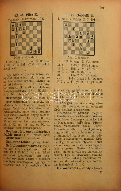 Chalupetzky Ferenc - Maróczy Géza: A győri Sakk-kongresszus, nemzetközi mesterverseny és főtorna 1924. Sakktörténeti cikkek. A mesterverseny összes, a főtorna válogatott játszmái. A nemzeti feladványverseny eredménye. Sakkfeladvány műszótár. Maróczy Géza és többek közreműködésével szerkesztette: Chalupetzky Ferenc. [Győr], 1924., Győri Sakkör, (Első Kecskeméti-ny.), 582+2 p. + 12 t. Átkötött félvászon-kötés, kopott borítóval, pótolt gerinccel, javított címlappal, 3 képtábla sérült, részben hiányos, egy képtábla firkált és szakadt, sérült lapokkal (516-529 p.)