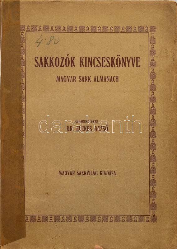 Schuster Zsigmond: A sakkföladvány-költészet műszabályai és Schuster Zsigmond sakkföladványai. Bp., 1908., Athenaeum, 103 p. Szövegközti fekete-fehér ábrákkal, sakk példákkal illusztrált. Átkötött félvászon-kötés, kopott borítóval. + Elekes Dezső: Sakkozók kincseskönyve. Magyar Sakk Almanach. Szerk.: Dr. - -. Bp., 1926., Magyar Sakkvilág, (Első Kecskeméti Hírlapkiadó- és Nyomda Rt.), 208 p. Kiadói papírkötés, sérült, javíottt gerinccel, a borító elvált a könyvtesttől, foltos borítóval.