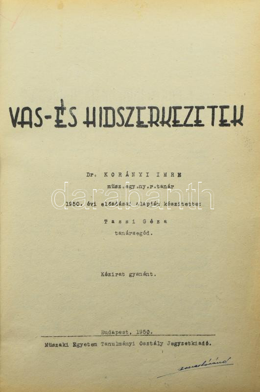 Korányi Imre: Vas- és hídszerkezetek. Dr. - - müsz. egy. ny. r. tanár. 1950. évi előadási alapján készítette: Tassi Géza tanársegéd. Kézirat gyanánt. Bp., 1950, Műszaki, 117+3 p.+IX t. Átkötött félvászon-kötés, kissé kopott borítóval.