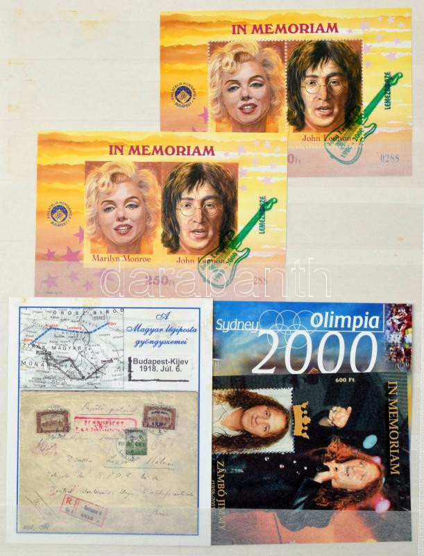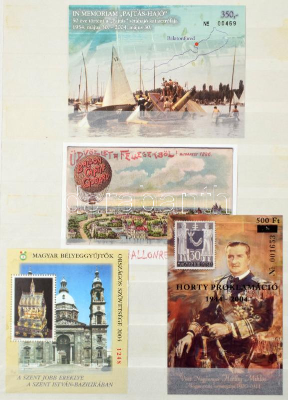 Beschreibung: 16 lapos A4-es berakó, benne 45 db emlékív jobbakkal + kevés bélyeg, nagyrészt betapadva vagy betapadás nyomokkal