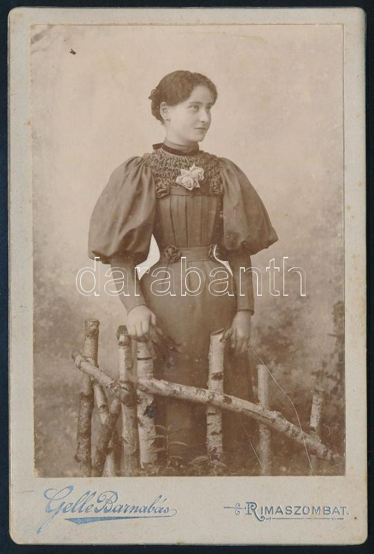 cca 1890-1900 Elegáns fiatal hölgy portréja, kabinetfotó Gelle Barnabás rimaszombati műterméből, rendkívül dekoratív verzóval, kissé foltos, 16,5x11 cm (Ritka!)