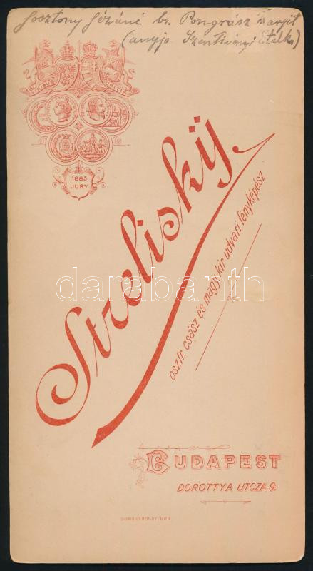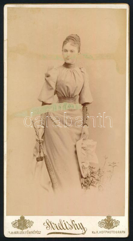 cca 1890 szentmiklósi és óvári báró Pongrácz Margit (1874-1939), gosztonyi és kövesszarvi Gosztony Géza (1873-1927) feleségének fiatalkori portréja, kabinetfotó Strelisky budapesti műterméből, felületén ázás nyomaival, 20,5x11 cm