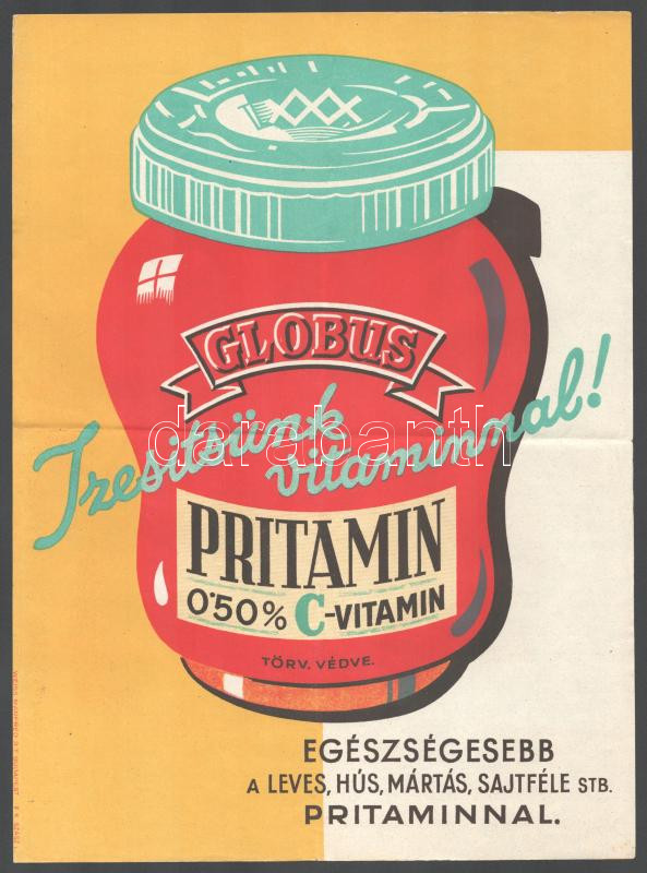 1939 A Weiss Manfréd gyár által gyártott konzervek reklámfüzete "Mit kell tudni a konzervekről" címmel, sok rajzzal, art deco stílusban valamint a hozzá tartozó Globus Pritamin reklámplakát, hajtott, 32×23 cm