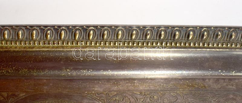 cca 19. sz. vége, Hatalmas méretű szervírozótálca, ezüstözött alpakka, kötegelt formájú fogókkal, pereménél körbefutó szemes és pontos díszítéssel, kopással, 80x50 cm
