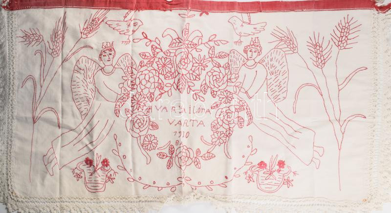 Beschreibung: 1930 Kézzel hímzett konyhai falvédő, "Varga Ilona varta 1930" felirattal, 51x95 cm