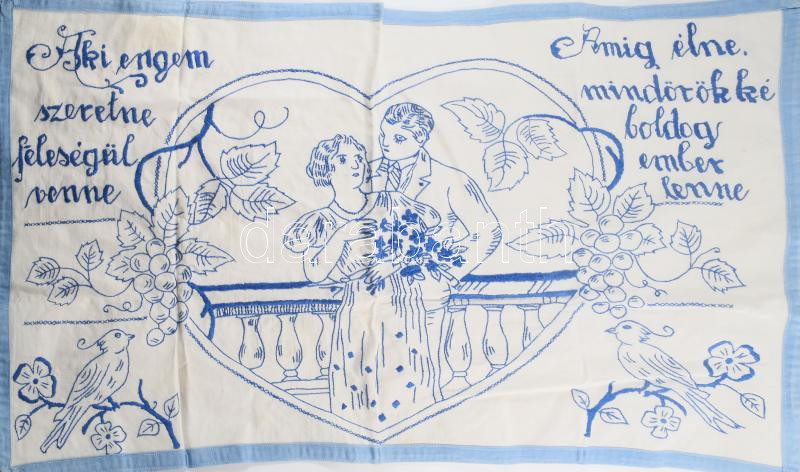 Kézzel hímzett konyhai falvédő, "Aki engem szeretne feleségül ven... https://www.darabanth.com/de/506-Fernauktion/506.0/Kunst-Dokumente-andere-Sammelgebiete/Design-Mode~639/Kezzel-himzett-konyhai-falvedo-Aki-engem-szeretne-felesegul-venne-amig-elne-mindorokke-~II3428762