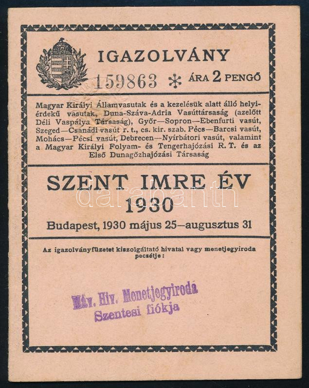 1930 Bp., Szent Imre év vasúti kedvezményre jogosító igazolvány https://www.darabanth.com/de/506-Fernauktion/506.0/Kunst-Dokumente-andere-Sammelgebiete/Dokument~62/1930-Bp-Szent-Imre-ev-vasuti-kedvezmenyre-jogosito-igazolvany~II3432706