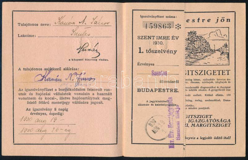 Beschreibung: 1930 Bp., Szent Imre év vasúti kedvezményre jogosító igazolvány