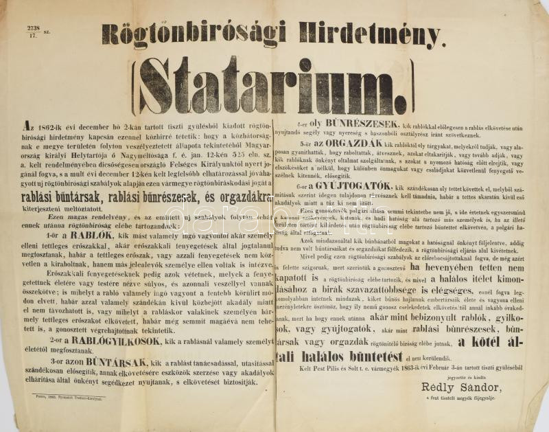 1863 Statáriumot kihirdető plakát Pest vármegyében 63x50 cm https://www.darabanth.com/de/506-Fernauktion/506.0/Kunst-Dokumente-andere-Sammelgebiete/Drucksachen~77/1863-Statariumot-kihirdeto-plakat-Pest-varmegyeben-63x50-cm~II3434878