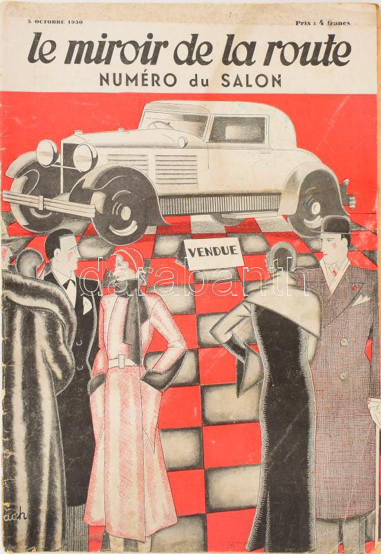 1930 Le miroir de la route. Numéro du Salon. 64 p. Francia nyelven. Rendkívül gazdag képanyaggal és art deco címlappal. Kiadói papírkötésben, sérült gerinccel, két lap szélén szakadással.