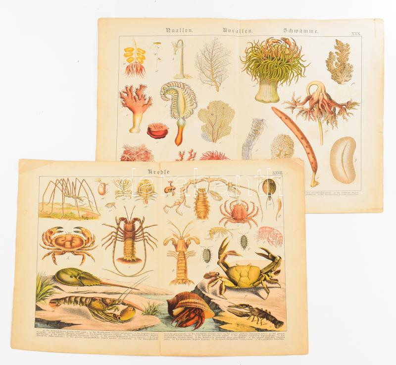 Beschreibung: Tengeri élőlények (rákok, medúzák, korallok, szivacsok), 2 db színes képtábla, kisebb lapszéli szakadásokkal, 33x42 cm