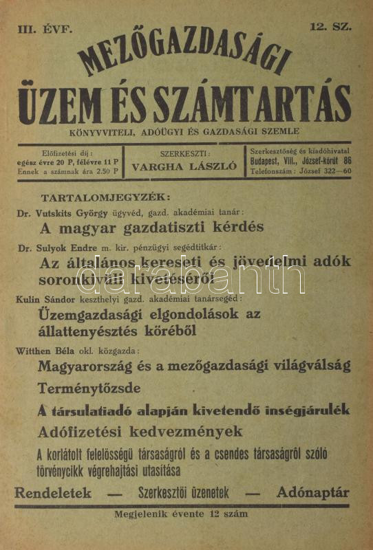 cca 1931 Mezőgazdasági Üzem és Számtartás III. évf. 12. sz., 241-264 p.;