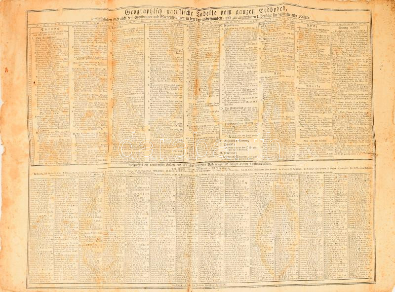 cca 1786 ,,Geographisch-statistische Tabelle vom ganzen Erdboden [...]", nagyméretű, német nyelvű táblázat, Karabinszky János Mátyás által kiadott lexikon/atlasz melléklete, Pressburg [Pozsony], Johann Matthias Karabinsky, hajtva, kisebb sérülésekkel, foltos, 55x72 cm
