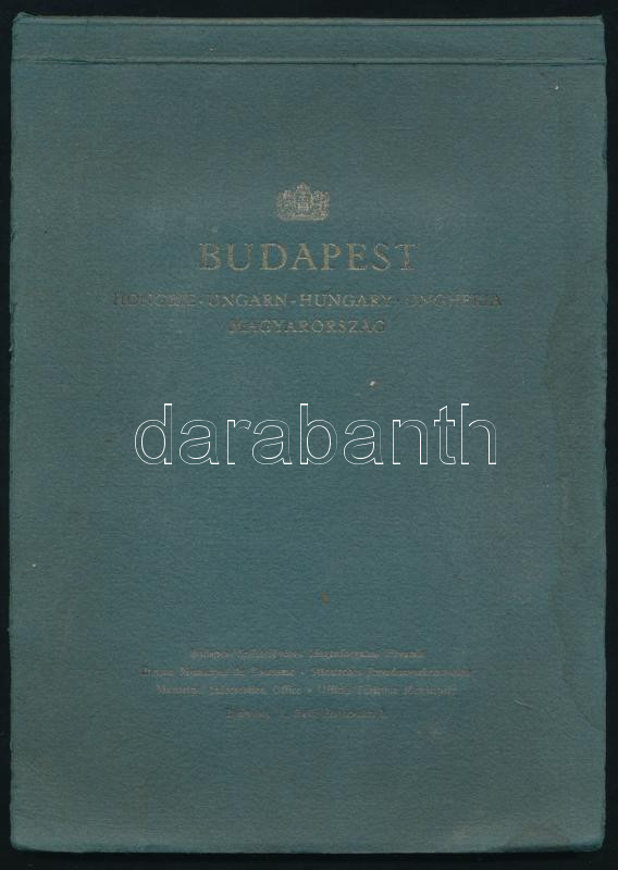 cca 1930 Budapest, album 12 db színes képpel (Budavári Palota a Tabán felől, Parlament, Mátyás-templom, Szent István Bazilika, stb.), ifj. Richter Aladár (1898-1950) festőművész munkáinak reprodukciói, többnyelvű képaláírásokkal. Kiadói papírkötés, kissé sérült, foltos borítóval, helyenként kissé foltos lapokkal, a hátsó borítón firkával, 24x17 cm, képméret: 14x9 cm.