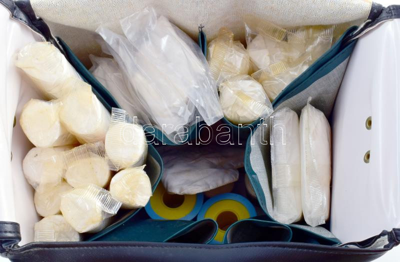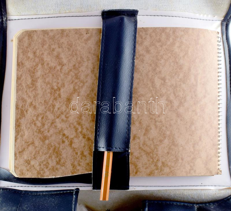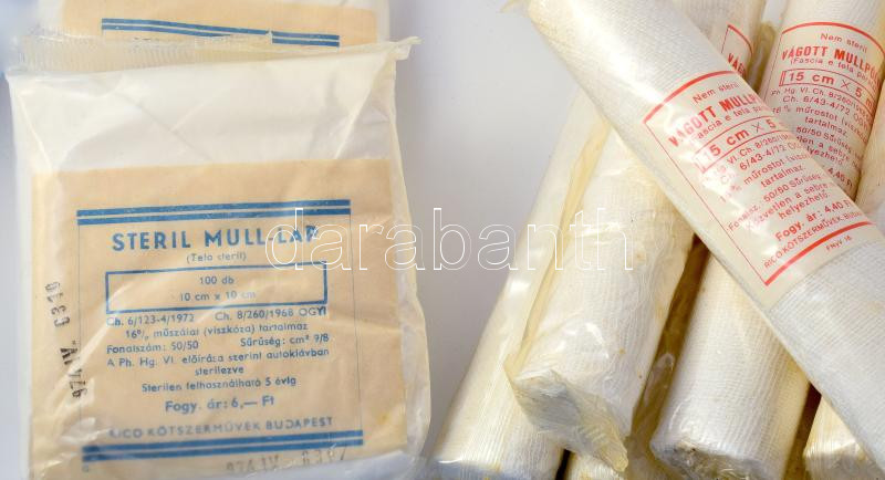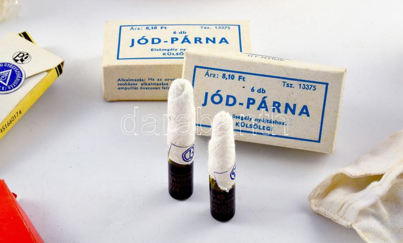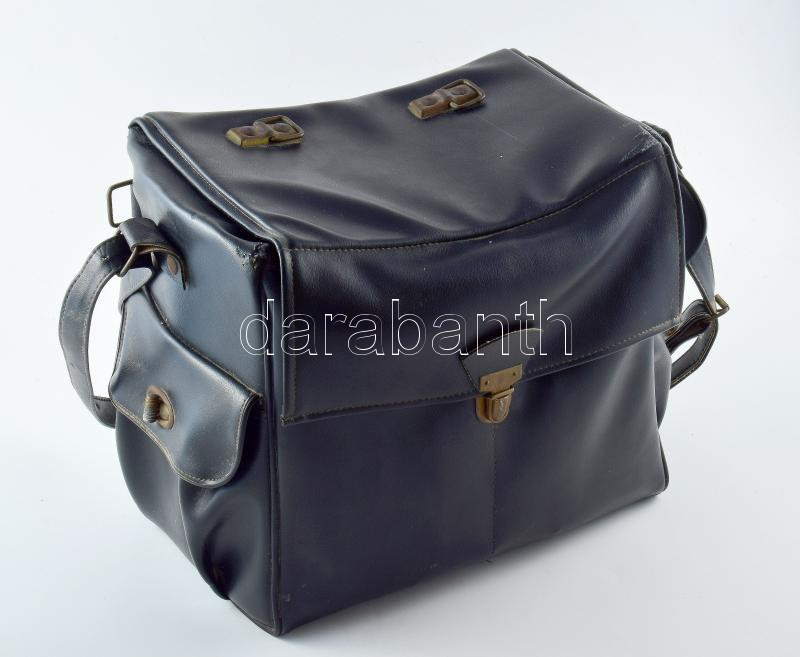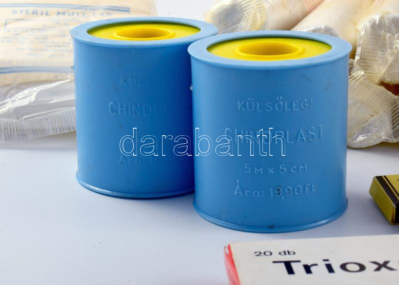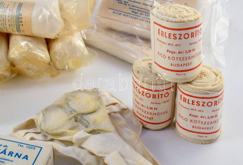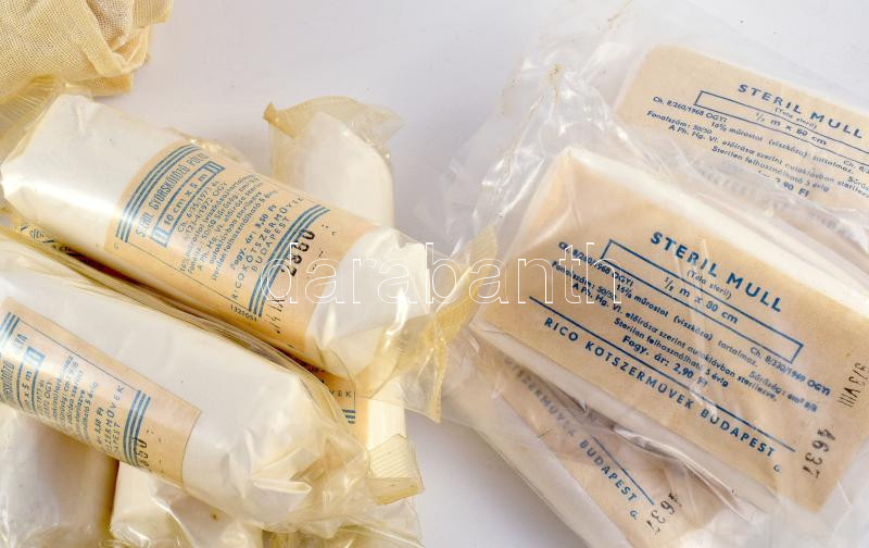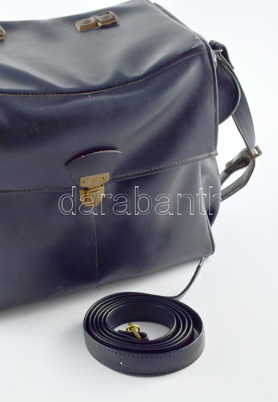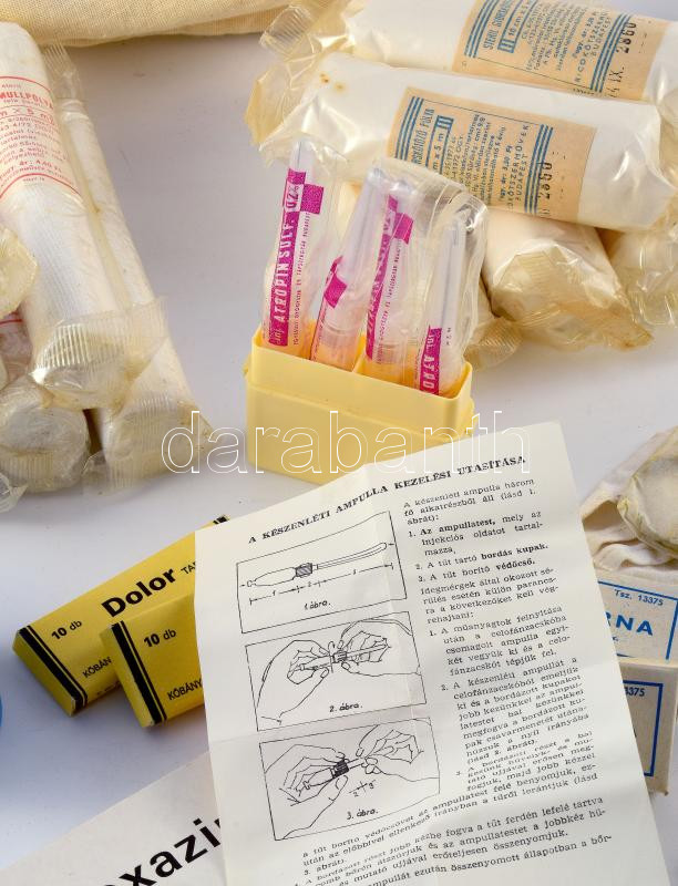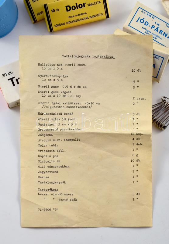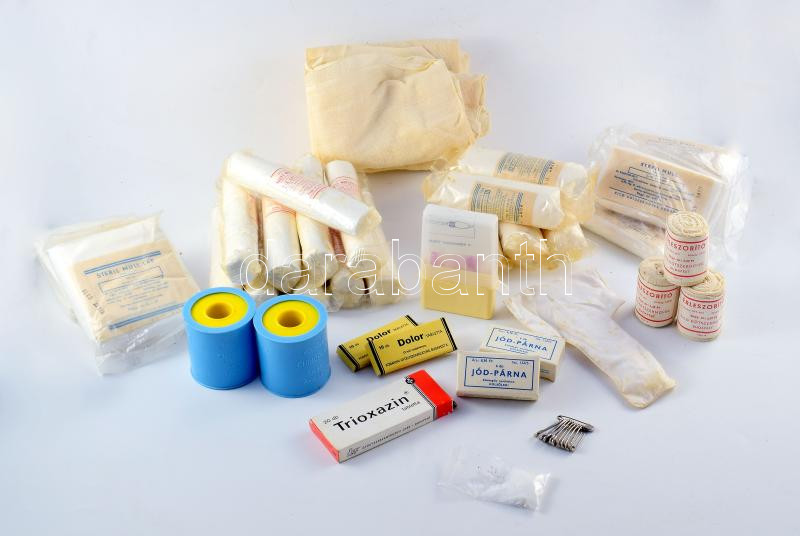 cca 1970 Egészségügyi rajtáska, valószínűleg úttörők által, hadijáték kellékeként használt elsősegély csomag, benne számos tartozékkal: kötszerek (steril géz, mullpólya), Chinoplast tapasz, gyógyszerek (Trioxazin és Dolor tabletta), ampullák, stb. (mind bontatlan); továbbá tartalomjegyzék, üres jegyzetfüzet és ceruza, illetve tartalék öv/szíj. Műbőr táskában, korának megfelelő állapotban, kb. 28x19x23 cm