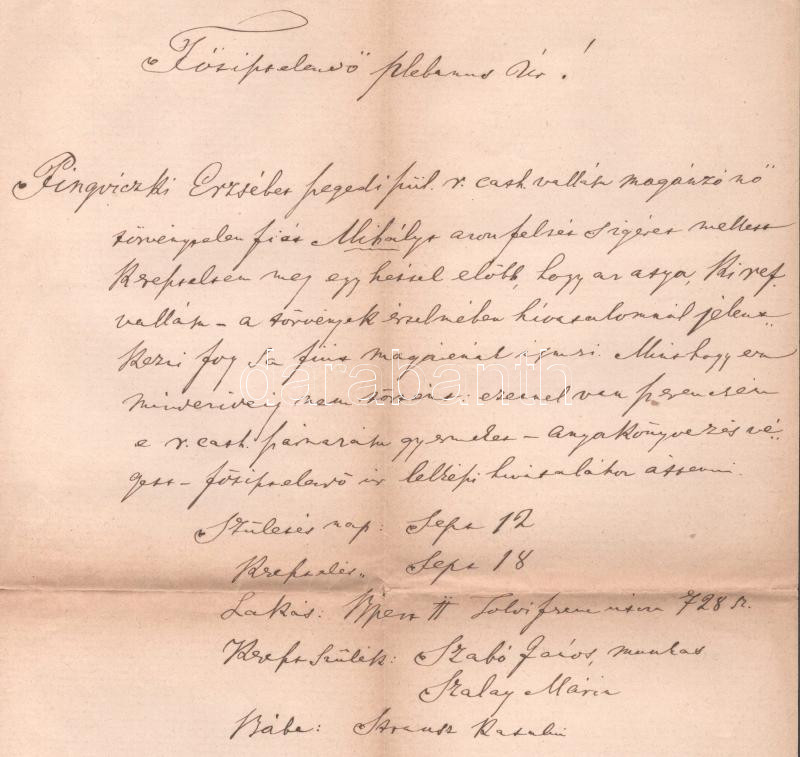1878 Bp.-Óbuda, Mészáros Sámuel református lelkész levele a római katolikus plébánosnak Pingviczki Mihály nevű törvénytelen gyermek megkeresztelése és anyakönyvezése ügyében