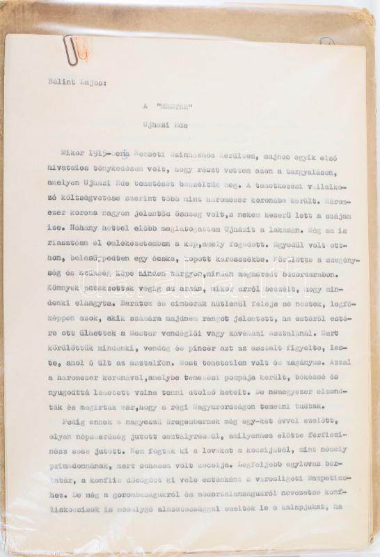Bálint Lajos, szül. Bleier (1886-1974) műkritikus, dramaturg, író, műfordító, a Thália Társaság egyik megalapítójának és titkárának 3 db gépelt kézirata: A "Mester" - Újházi Ede; Kelemen László; Ottlik Géza: Iskola a határon. Változó állapotban.