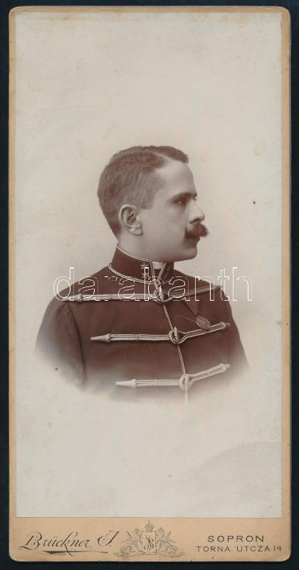 Beschreibung: 1902 Sopron, katonatiszt Jubileumi Udvari Emlékérem kitüntetéssel, keményhátú fotó Brückner Ignác soproni műterméből, a hátoldalon autográf dedikációval, 21x10,5 cm