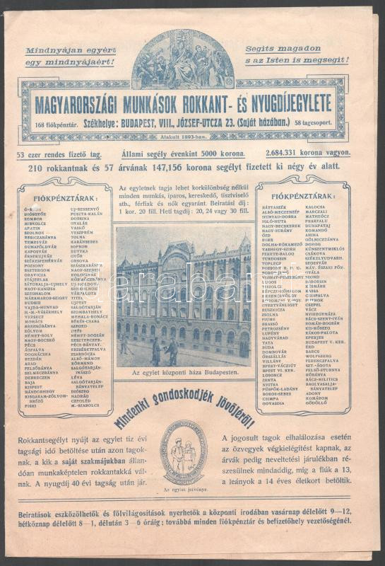 1908 Magyarországi Munkások Rokkant- és Nyugdíjegylete, VIII. József u... https://www.darabanth.com/de/506-Fernauktion/506.0/Kunst-Dokumente-andere-Sammelgebiete/Werbungen~67/1908-Magyarorszagi-Munkasok-Rokkant-es-Nyugdijegylete-VIII-Jozsef-u-23sz-4p-reklamlap-~II3431645