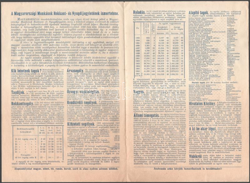 Beschreibung: 1908 Magyarországi Munkások Rokkant- és Nyugdíjegylete, VIII. József u. 23.sz.; 4p. reklámlap, ismertető kiadvány