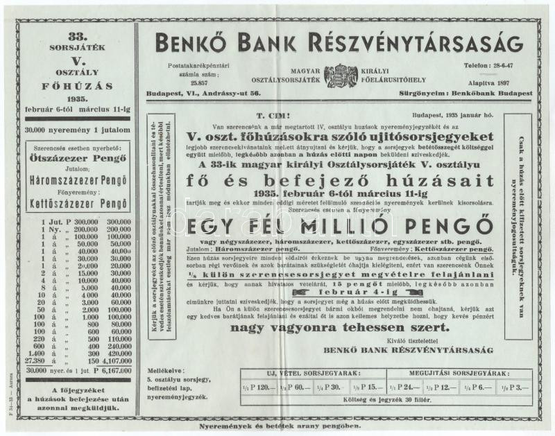 1935. "33. Magyar Királyi Osztálysorsjáték" 5. osztály egynyolcad sorsjegye "H", vízjeles papíron, a "Benkő Bank Rt." bélyegzőjével, felbélyegzett borítékkal, a cég levelével, nyereményjegyzékével és tájékoztatójával az 1939-es/1940-es évre, valamint a befizetésről szóló elismervénnyel T:AU