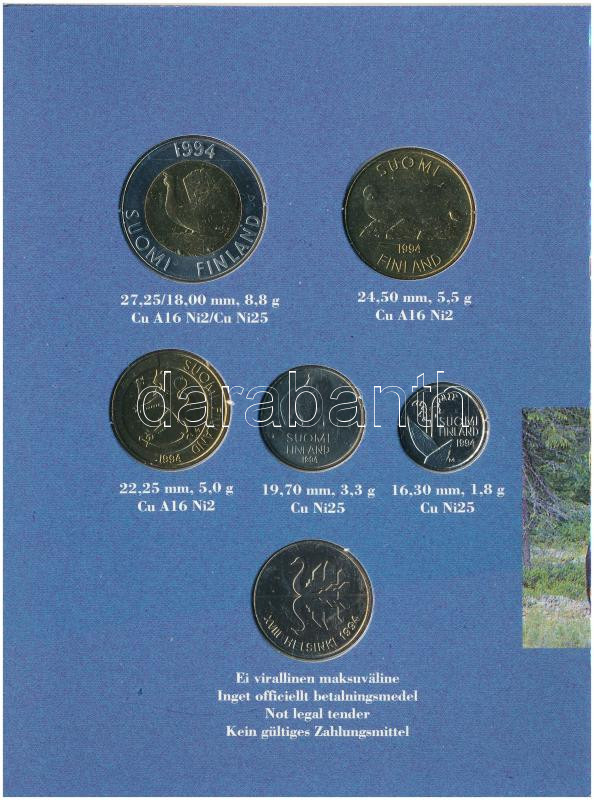 Beschreibung: Finnország 1994. 10p - 10M (5xklf) forgalmi sor + "Finn Pénzverde " Cu-Ni zseton szettben, karton dísztokban T:UNC