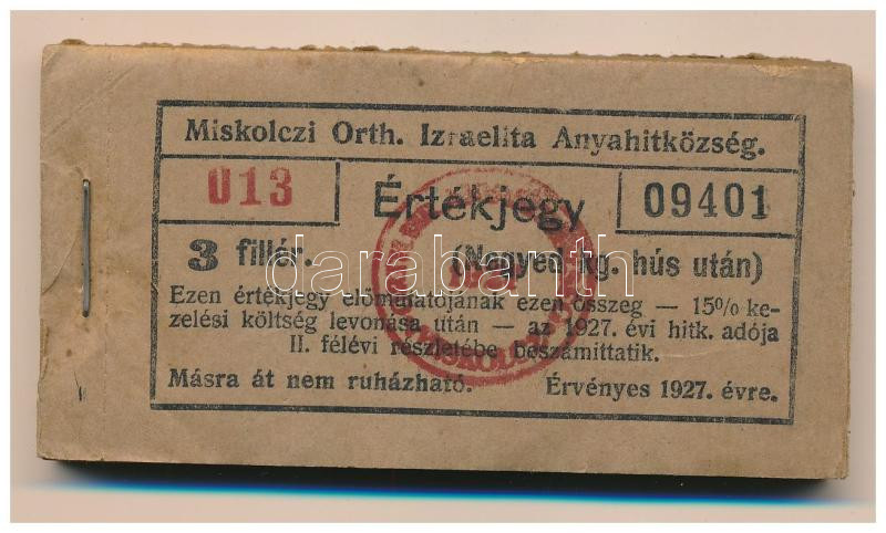 1927. Miskolc 3f "Miskolczi Orth. Izraelita Anyahitközség" vágatási jegy / értékjegy 1/4kg hús után (100x), teljes tömb "013 09401 - 013 09500" között T:AU, az első darab XF