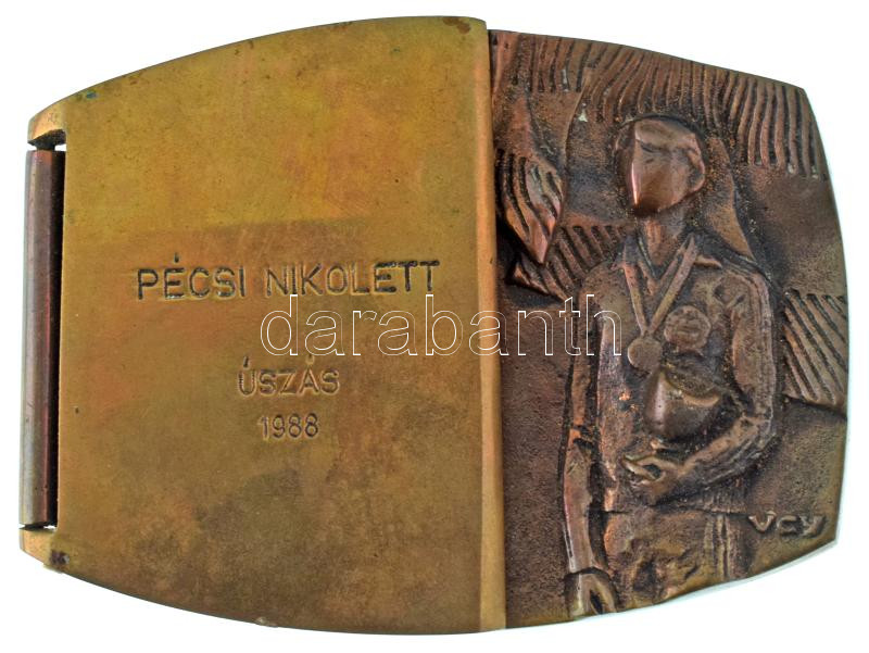 1988. "Kiváló Ifjúsági Sportoló - Úszás - Az ÁISH Elnökétől" egyoldalas, kihajtható bronz plakett névre szóló gravírozással. Szign.: Várhelyi György (83x112mm, kinyitva 83x170mm) T:AU