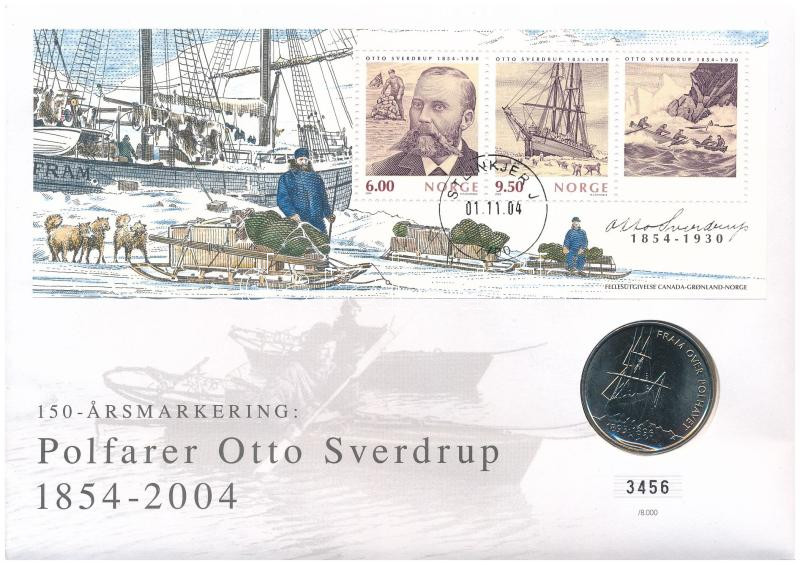 Norvégia 1996. 5K Cu-Ni "Nansen visszatérésének 100. évfordulója az Északi-sarkvidékről" számozott, felbélyegzett "150 éves évforduló: Otto Sverdrup 1854-2004" borítékban, bélyegzéssel (3456/8000) T:UNC