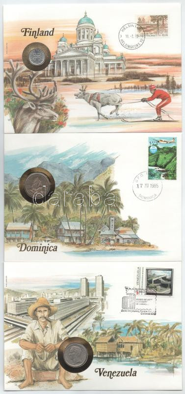 Vegyes, 3xklf érmés boríték tétel, bélyeggel, bélyegzéssel és német nyelvű leírással, benne: Finnország 1979. 1p + Kelet-Karibi Államok / Dominika 1981. 25c + Venezuela 1967. 1B T:UNC, Venezuela VF