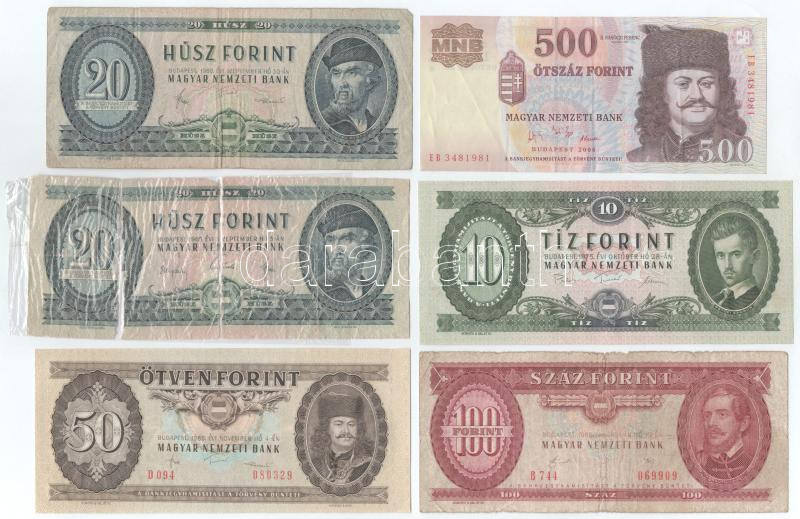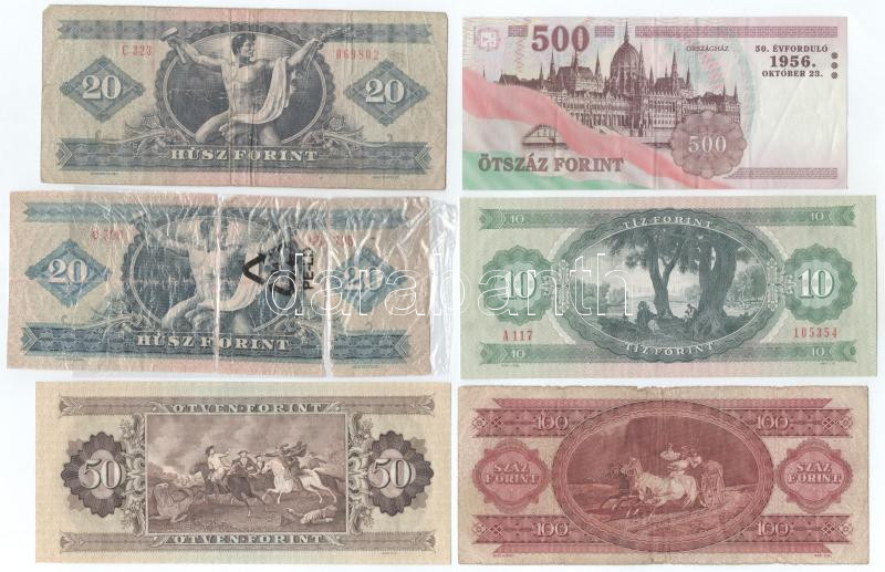 Beschreibung: 1965. 20Ft szakadt + 1975. 10Ft + 1980. 20Ft + 1986. 50Ft enyhén ferde nyomat + 1989. 100Ft + 2006. 500Ft "Az 1956-os forradalom 50. évfordulója" T:VF-Pr közte szép papír