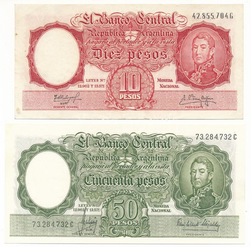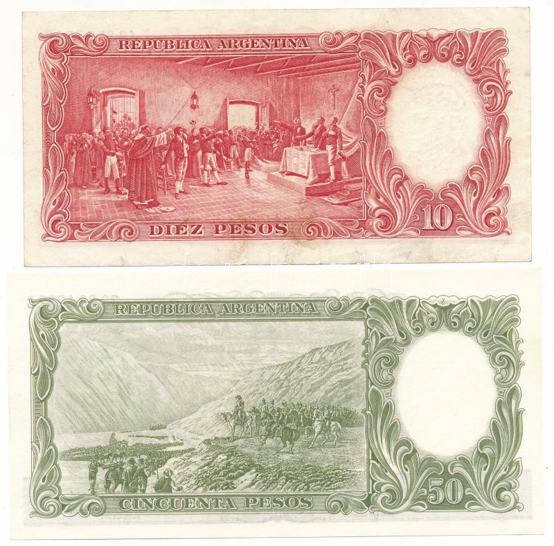 Argentina ND(1960-1962) 10 Pesos + ND(1965-1966) 50 Pesos C:AU, F fine paper