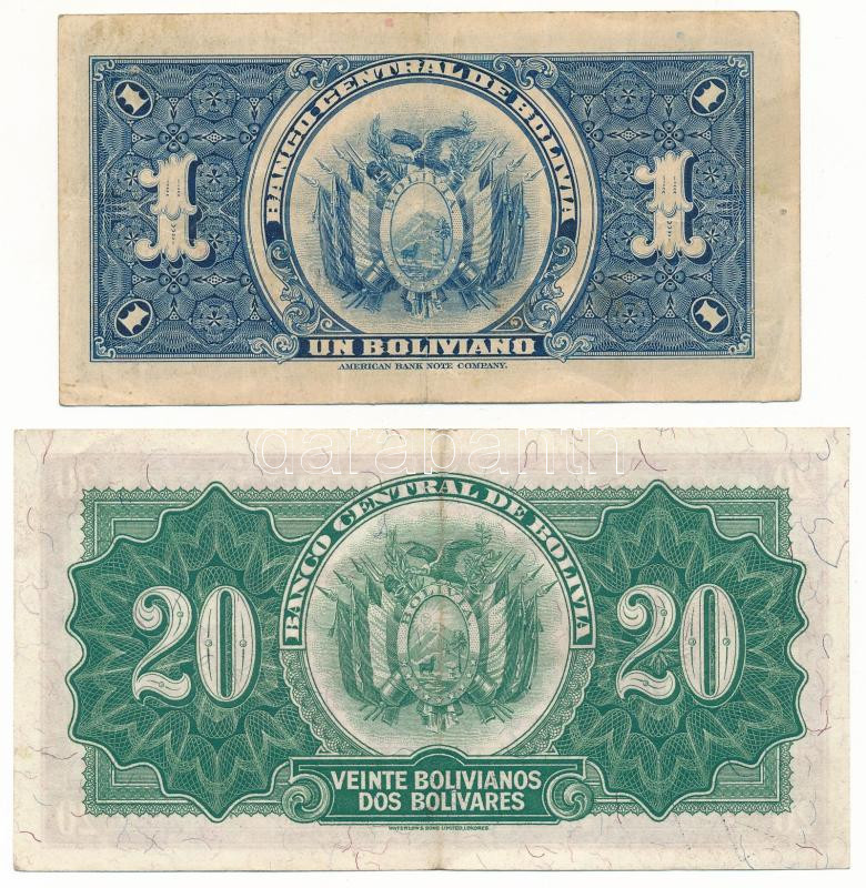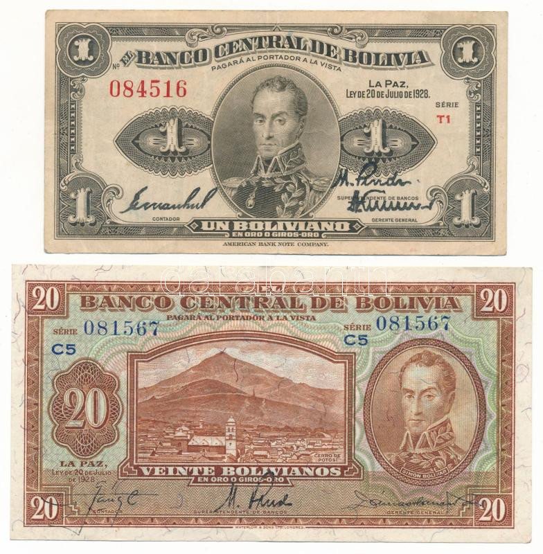 Bolivia 1928. 1 Boliviano + 20 Bolivianos / 2 Bolivares C:XF,F