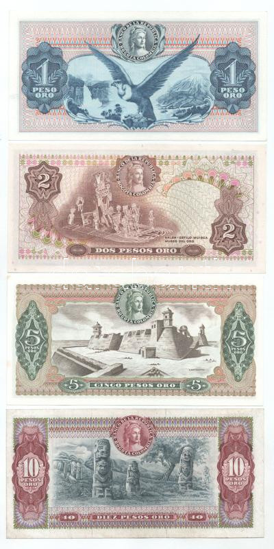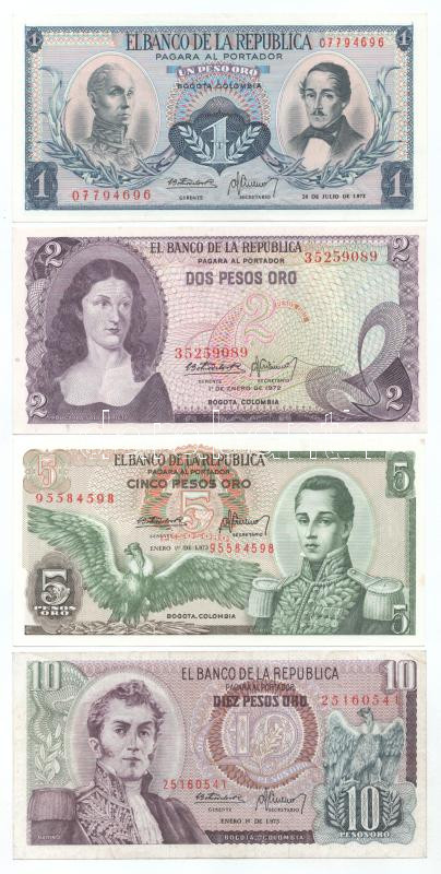 Colombia 1972. 1 Peso Oro + 2 Pesos Oro + 1973. 5 Pesos Oro + 10 Pesos Oro C:AU, including an F fine paper