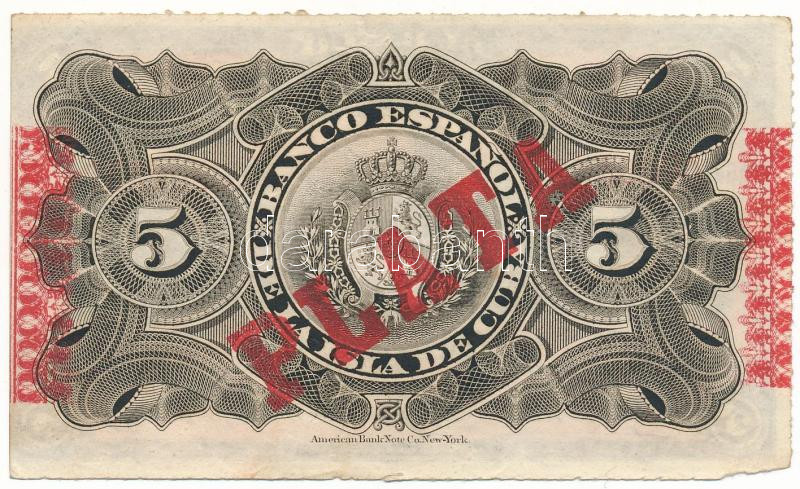 Cuba 1896-May-15. 5 Pesos with red "PLATA" overprint on the reverse, "0808552 F" C:F, fine paper, tiny missing material