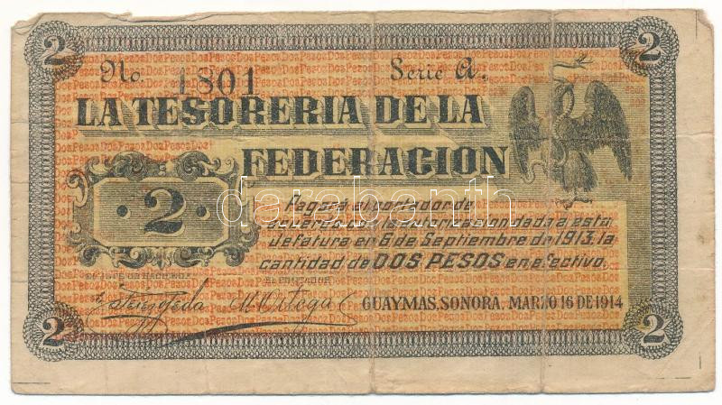 Mexikói államok / Sonora / Guaymas 1914. 2P "La Tesorería de la Federación" helyipénz "A 1801" T:F,VG