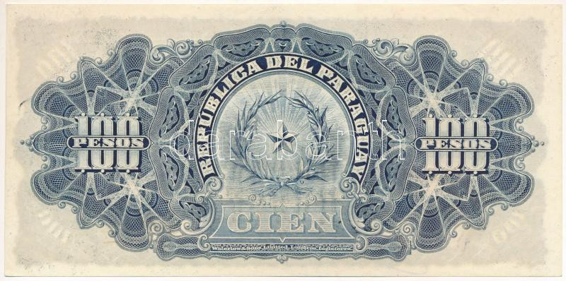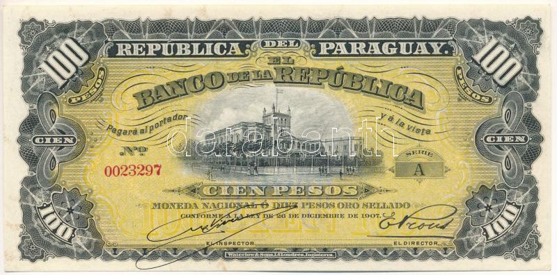 Paraguay 1907. 100P / 10P "Moneda Nacional", "0023297". Szign.: "M. Viveros" & "E. Prous" T:AU,XF, hajtatlan, enyhén hullámos papír, sarokhajlás