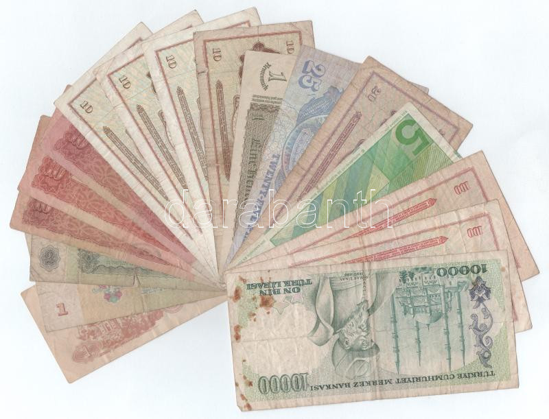Mixed 17pcs foreign banknote lot, including Netherland 1973. 5 Gulden + Yugoslavia 1978-1986. 10 Dinara - 100 Dinara (3xdiff, 7pcs), etc. C:F,VG