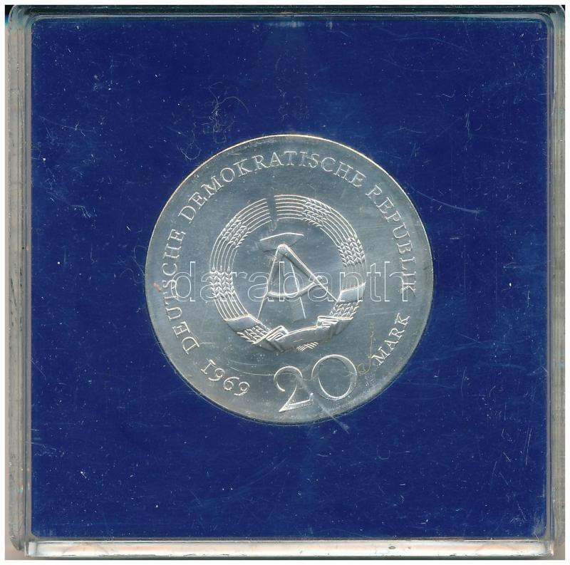 GDR 1969. 20 Mark Ag "220th Anniversary of birth - Johann Wolfgang von Goethe" in plastic case C:UNC