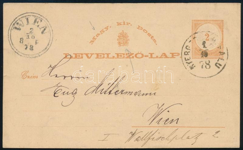 1878 2kr díjjegyes levelezőlap "NYERG(ES-UJ)FALU" - Wien https://www.darabanth.com/de/506-Fernauktion/506.0/Philatelie-und-Postgeschichte-Ungarn/Ausgaben-1874-1899~32/1878-2kr-dijjegyes-levelezolap-NYERGES-UJFALU-Wien~II3256196