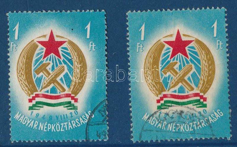 Beschreibung: 1949 Alkotmány I. 1Ft 2 db bélyeg a "T" betűn vonalka lemezhibával (11.000)