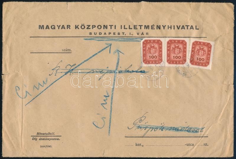 1946 Hivatalos levél 43 db bélyeggel, először Budapestről Püspöknádasdra küldve, majd visszaküldve Budapestre / Official cover with 43 stamps, returned