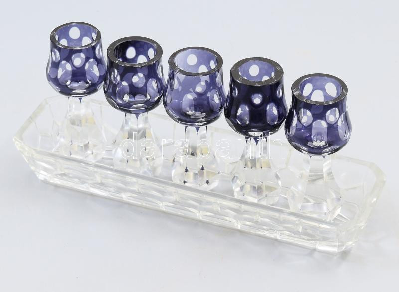 Beschreibung: 5 darabos lilán pácolt röviditalos kristály pohár szett, tálcában, pattogzásokkal, m: 9,5 cm