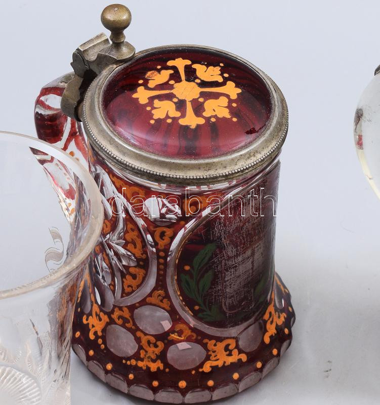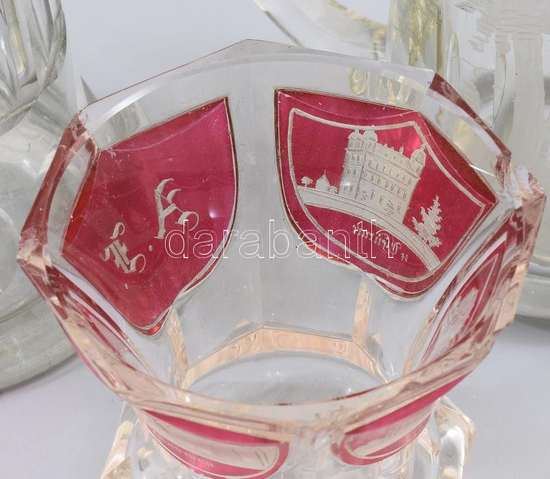 Beschreibung: cca 1840-1880, 6 darab biedermeier pohár és korsó, közte címeres darabbal, pattogzásokkal, sérülésekkel, m: 23,5 cm alatt