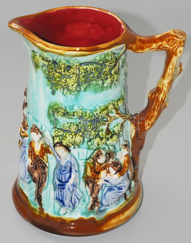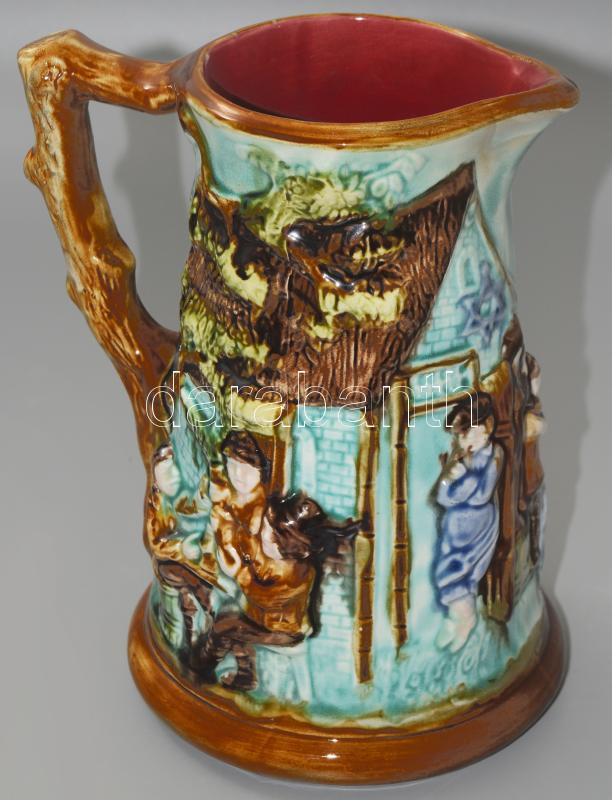 Beschreibung: cca 1890-1910 Faiencerie de Nimy plasztikus életkép mintás boroskancsó, jelzett, hibátlan, m: 23,5 cm